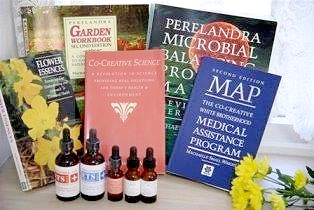 (写真:ペレランドラ社が出版した本とエッセンス と アメリカバージニア州にあるペレランドラガーデンの中心に置かれたクリスタルとテンソルエネルギーのグリッド。これによって自然のバランスが保たれている。)
